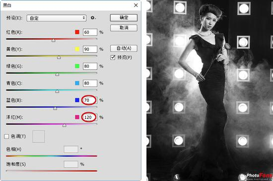 (7)再设置“蓝色”值为70%, 强调出人物侧面轮廓光,“洋红”值为120%,提亮轮廓光,突出人物手中红玫瑰,如图所示。