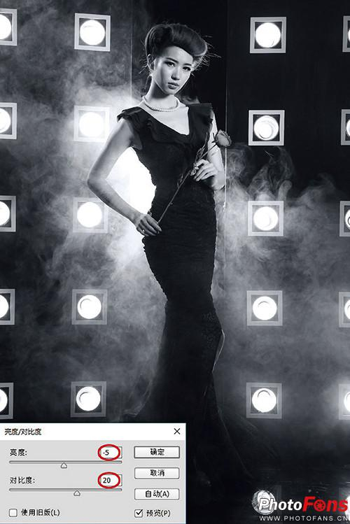 (10)在弹出的“亮度/对比度”对话框中,设置“亮度”值为-5,“对比度”值为20,以巩固黑白效果,呈现良好的光影对比,做到不失层次、不显灰又有厚重感,如图所示。