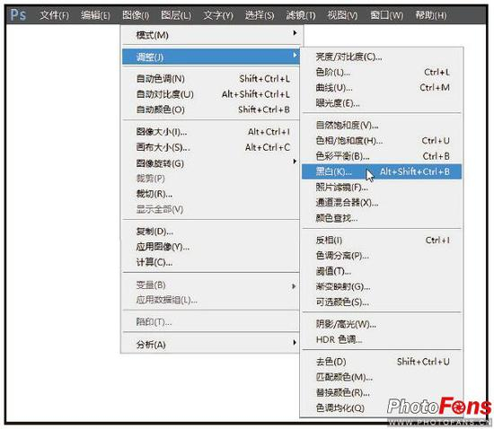(3)在“图像”菜单中,执行“调整”>“黑白”命令(快捷键Alt+Shift+Ctrl+B),如图所示。