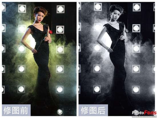 (1)打开一张风范美妇的优雅照片,背景聚光,烟雾缭绕,一袭黑色晚礼服的美妇人红玫瑰在手,光比塑造明显,搭配经典,如图所示。