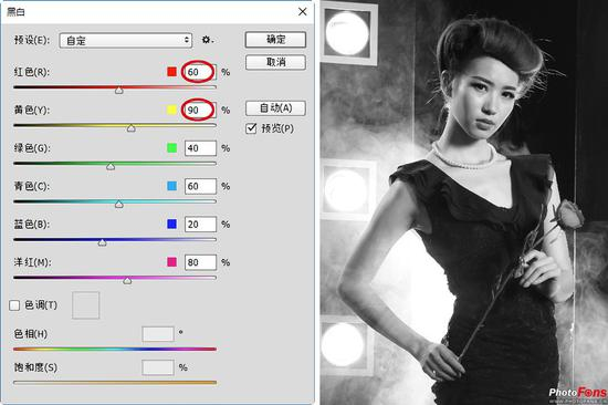(5)要做好这张照片的黑白效果,不能靠默认设置,简单满足于现有的黑白色调。首先,设置“红色”值为60%,“黄色”值为90%,提亮偏暗的人物肤色,调节彩色的红色与黄色亮度,起到补光皮肤的作用,如图所示。取消勾选“预览”,可以观察原有的彩色,来判断需调整的对应色彩。
