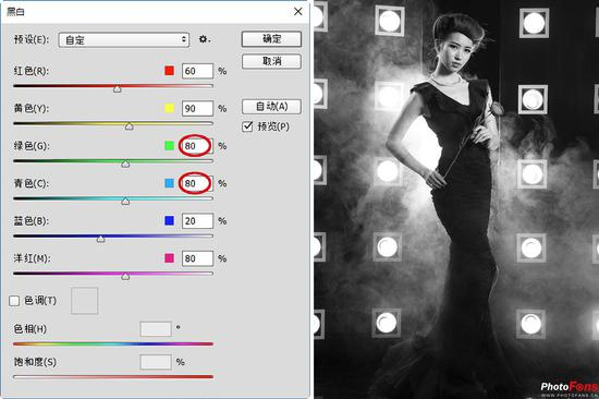 (6)接着,设置“绿色”值为80%,“青色”值为80%,以加强背景灯光和烟雾感,更好地衬托人物,显出空间感,如图所示。
