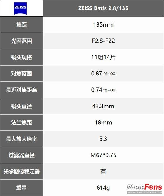 下面我们先来看一下Zeiss Batis 135mm F2.8的详细参数: