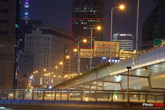夜间拍摄一般都需要用到长时间的曝光,在长时间的曝光下,镜头对光线的处理能力就显得尤为的重要,为了查看Zeiss Batis 135mm F2.8在夜间拍摄是否会出现扭曲光斑。我们使用F8的光圈值对准标识区域内的路灯进行拍摄测试。