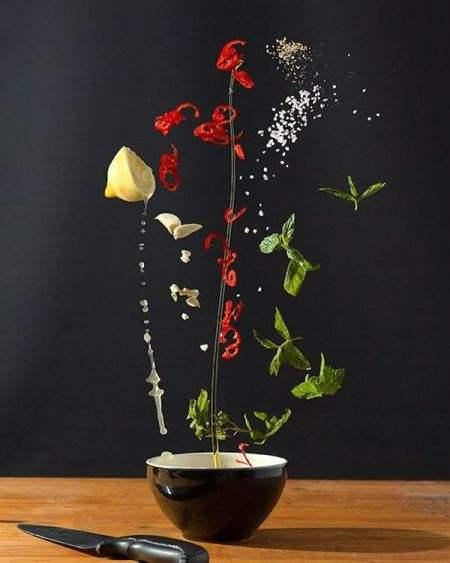 当你适应了这种思维,你会惊讶的发现自己的想法是多么富有创造力。在文章中有一张把柠檬挤出的水和其他的材料都是由空中坠入碗中,这样比直接把这些东西放碗里面拍有趣多了,我们之中又有多少人能想到这个点子呢?