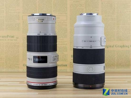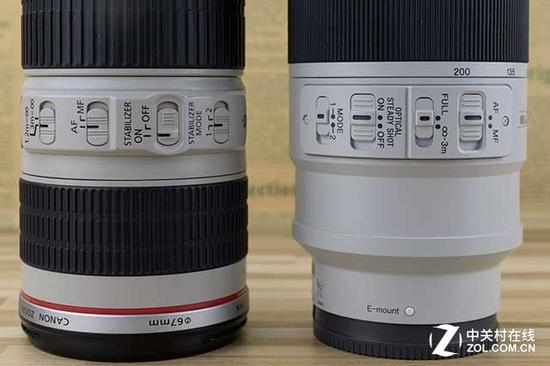 佳能70-200 F4(左)配有对焦窗,索尼70-200 F4(右)配有对焦锁定键