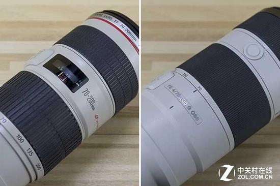 佳能70-200mm F4(左)在卡口处配备了橡胶圈,镜头密封性更好