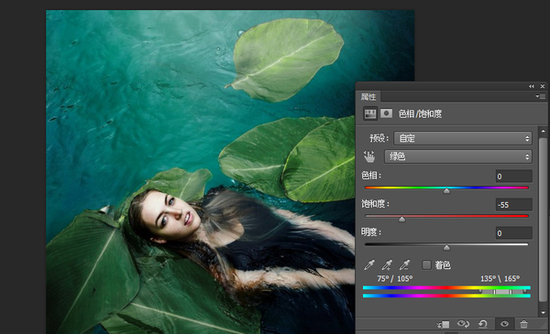 色彩的定向分离。这个名词是不是从没听过,看起来高大上有没有?咳咳,这可是个很严肃的课题。什么叫色彩的定向分离呢?首先,我们来讲一下什么叫色彩分离。其实,色彩分离我们到处都在用。比如可选颜色工具、色相/饱和度工具。它包含两步:选中某种色彩,然后对该选中色彩进行调整,这里特指去色。举个例子,如果我们只想降低画面中叶子的饱和度,怎么办,请看下图: