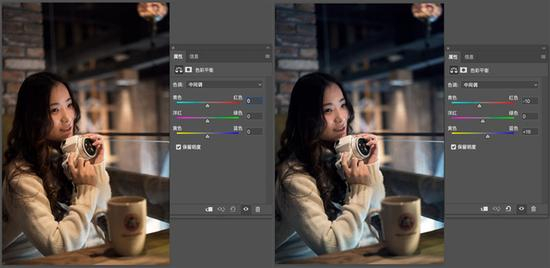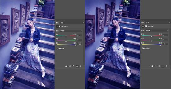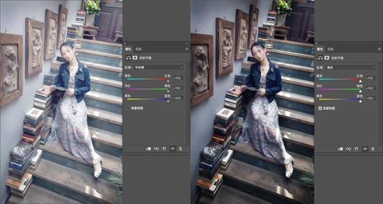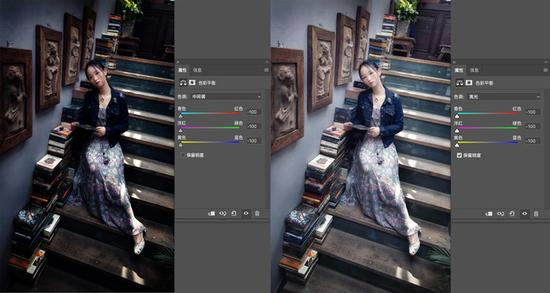 向左调整色彩平衡中多个参数,左图未勾选“保留明度”,由于减色原理,画面被压暗右图勾选“保留明度”,画面亮度不变