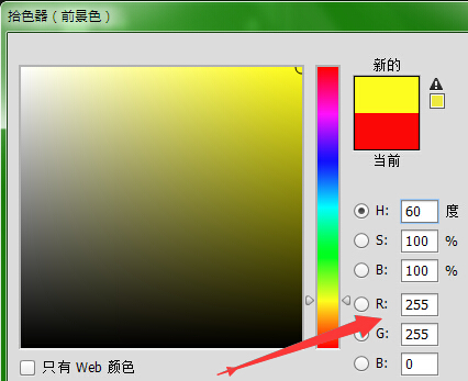 等量的红绿相加而蓝为0值时得到黄色: