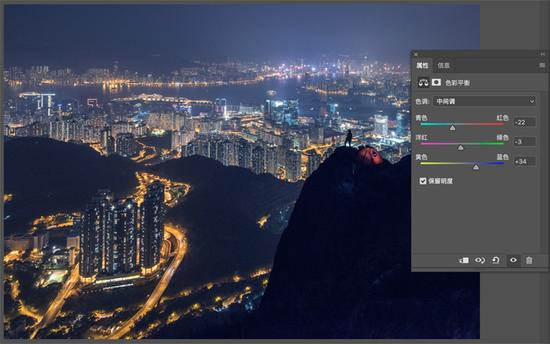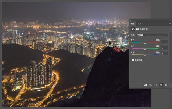 城市风光摄影中,由于光污染和雾霾,原图很容易色彩偏黄,我们利用色彩平衡工具将画面调整成蓝调,画面立刻通透了许多。