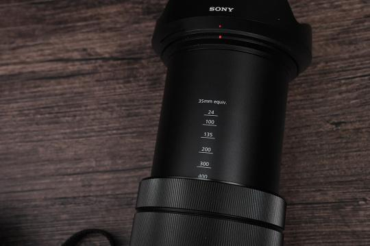 相机的镜头完全伸出之后还是挺长的。变焦是通过机身上的变焦拨杆实现的,也可以手动镜头上的变焦环进行为了方便用户大致了解当前的焦距,RX10 IV还在镜筒上印上了焦距数值,多大焦距一目了然。