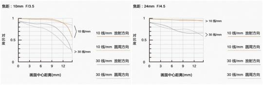 从官方给出的MTF图可以看到,它整体的成像可以接受。无论是10mm还是24mm端,中心锐度都很好。10mm端靠近画面边缘的位置锐度下降是比较明显的,而24mm端要好一些。总的来说,符合它的定位。