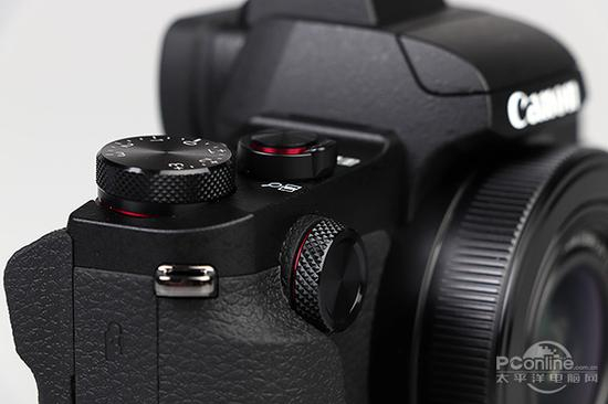 我不得不提的一点就是,转盘的设计真的太炫了!可能我本身是一个模型控,对电镀红、电镀蓝这种颜色真的喜爱得无法自拔。这几抹电镀红成为了佳能G1 X Mark III最亮眼也是识别度最高的地方。