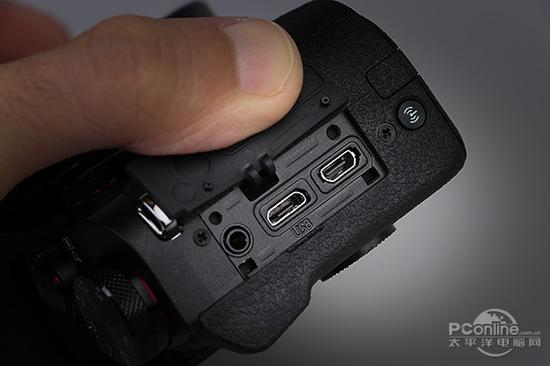 佳能G1 X Mark III在机身右侧边配备了三个外接输出接口,一个是快门线接口,一个是micro USB接口,另一个是micro HDMI接口。在接口的下方有一个独立的无线传输按键,可以拍完之后迅速传输到智能手机并分享。