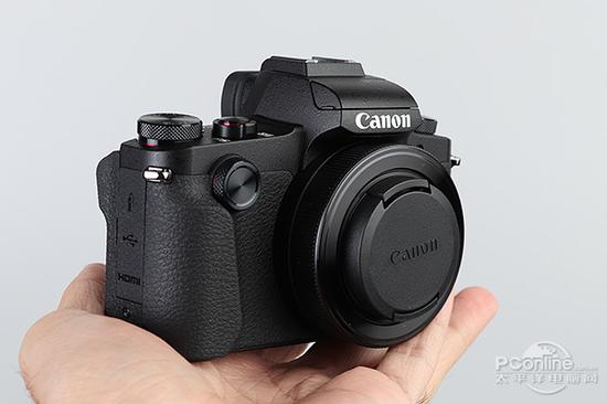 这次佳能G1 X Mark III外观的大转变,让我有一种它要成为EOS M行列成员的错觉。光从外观上看,确实非常非常接近——突起的军舰部配备热靴,自带高清晰度236万画点的电子取景器,还有左右各一个专业转盘,看起来就是一台缩小版的EOS M5。如果不是因为它自带固定的等效24-72mm变焦镜头,说它是一台EOS M也不足为奇。
