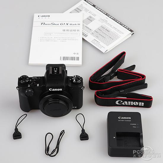 开箱之后,佳能G1 X Mark III国行套装里的东西一目了然。里面包含的东西有主机,相机带、相机带调节环、充电器、电池(已安装到机内)、说明书和保修卡。佳能G1 X Mark III自带的充电器为一体式充电器,不需要使用AV电源线。