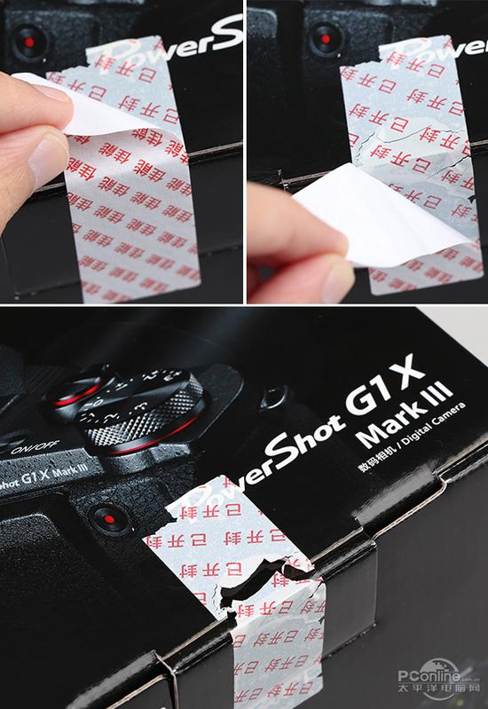 佳能此前更新过一次性封贴,可以通过扫码验明真伪,而G1X Mark III上的这个封贴用回老版本不带防伪扫码功能的标贴。揭开表层之后,就会看到极易破碎的内层薄膜显示已开封,一旦打开箱子,立即开裂,不可再恢复。