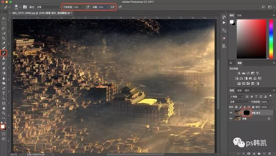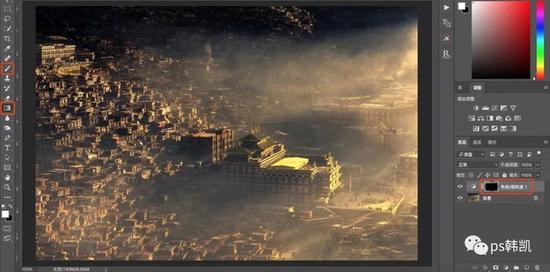 4、那这里呢,在白色蒙版上,把不需要减饱和的地方涂上黑色(黑色代表着减饱和的调整不显现,白色代表着减饱和的调整显现)这样就做到了局部调整,只降低了远处房子的饱和度,其他并没有影响所有的调整图层,做了某些调整之后,都可以用蒙版来控制调整的区域(白色代表调整显现,黑色代表不调整不显现,灰色代表着半显现)这样就达到了精确的局部调整。