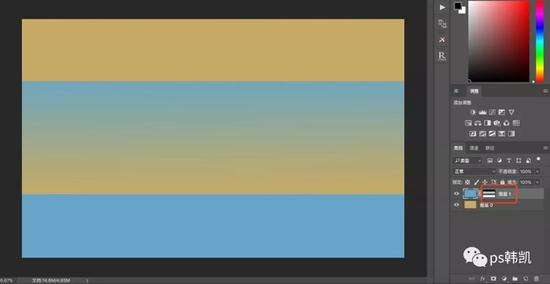 3、点击蒙版工具,在图层1上面生成一个白色蒙版(此时,白色蒙版代表蓝色全部显现,所以看不到下面黄色的图层)。