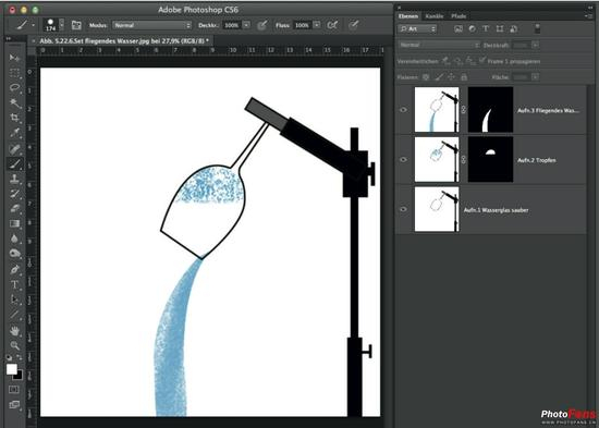 我把水滴的曝光放在第一次曝光之上。除了水滴部分,整个图层用蒙版遮挡,再上方是流水图层。同样,只有水流的细节被显示出来,其余部分被蒙版遮挡。只要经过练习,这些工作可以在几分钟内完成。最终图像细节清晰,处理得特别干净(图5.34)。