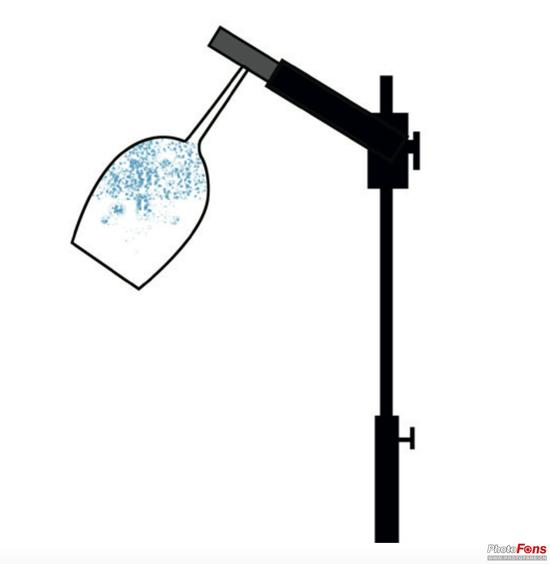 首先,把水杯设置好。它应该向下倾斜 45°~90°,这样水倒入后就会向外流出,但速度又不会过快。然后,当所有东西准备妥当,水杯确保干净光亮,我设置好相机,拍摄了第一次曝光。如果要拍摄玻璃杯上的水珠,我会先在里面喷一些浴室清洁剂。让清洁剂的泡沫在杯子上保持几分钟,然后快速把它擦掉,并用无绒布把杯子擦干净。现在,如果要固定杯子,最好带上棉手套再碰它。然后,喷在杯子上的水珠就会圆润清透,并且可以固定在杯子上,几乎不流动。