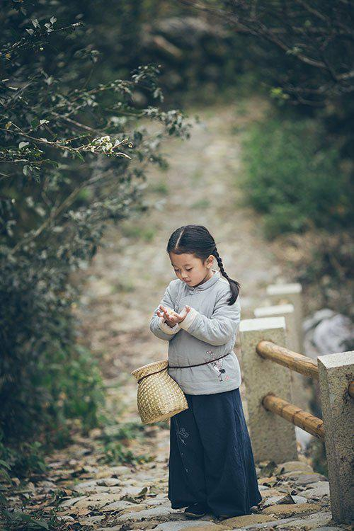 光线从两侧的屋檐中间照射下来,女孩略微抬头迎向光线,用反光板为面部补光,消除下巴等位置的阴影。