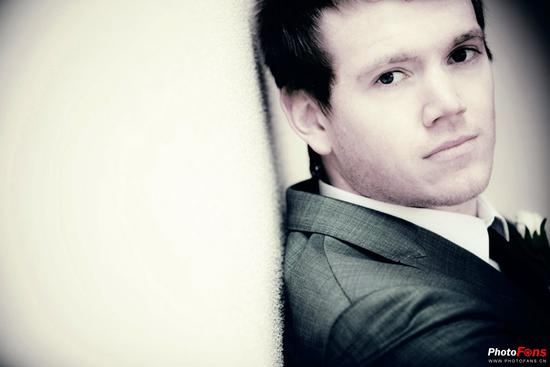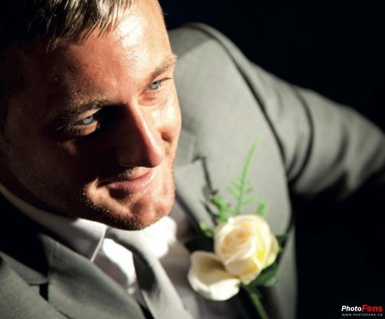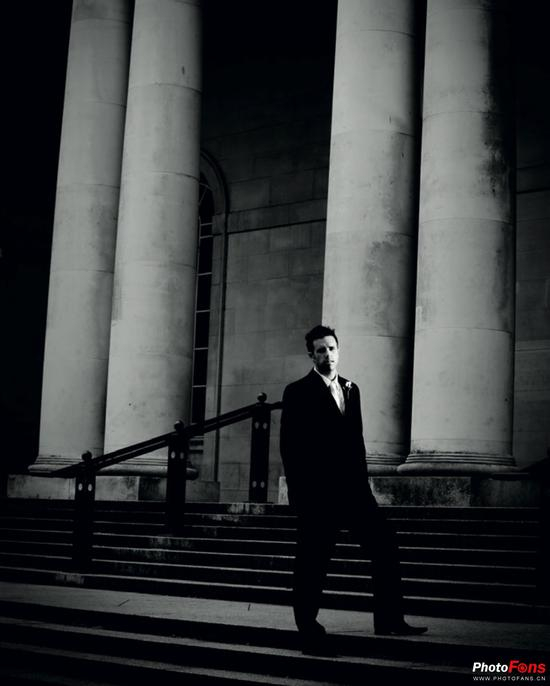男性的站姿看起来应该更有力,所以让新郎面对相机以双脚站立,挺胸会增加体型的魁梧感。阔步站立是产生强壮感觉的姿势。但是,如果被摄体需要苗条一些,让他把脚和肩膀转向稍微远离相机的方向。头部的位置通常是正对相机,这也能给人以充满力量的感觉。但是,要确保表情与姿势相配合,不要让被摄体看起来很痛苦的样子!