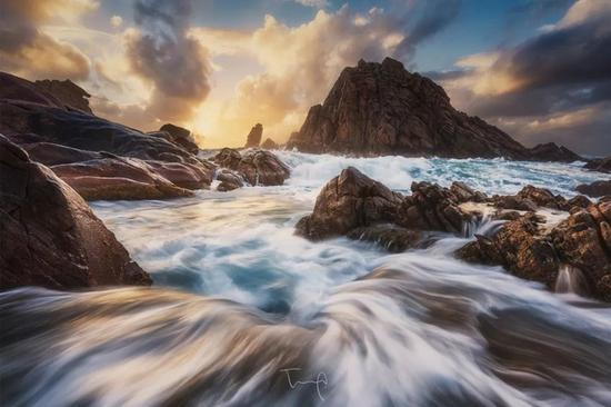 包含在这张照片里的线条大家应该能很明显看出来,就是水流的方向。慢门能拍出线条感但是这里绝不是仅仅依靠慢门。我在场景中来回走动取景,海边礁石有大有小,浪花有高有低,我之所以选择画面中的角度进行拍摄,是因为我观察到在浪花上来之后,海水褪去的过程中它能形成有明显方向感和汇聚感的水流,并且能和海面组成一个S型的曲线,让我们随着水流望向远处的礁石。