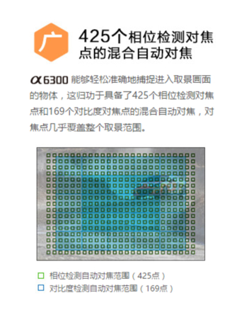 关于机身功能,首先是对焦系统。索尼A6300搭载了索尼自家的4D对焦系统,共有对焦点425个。几乎是满屏的对焦覆盖范围,可以让我们在构图时更加从容。
