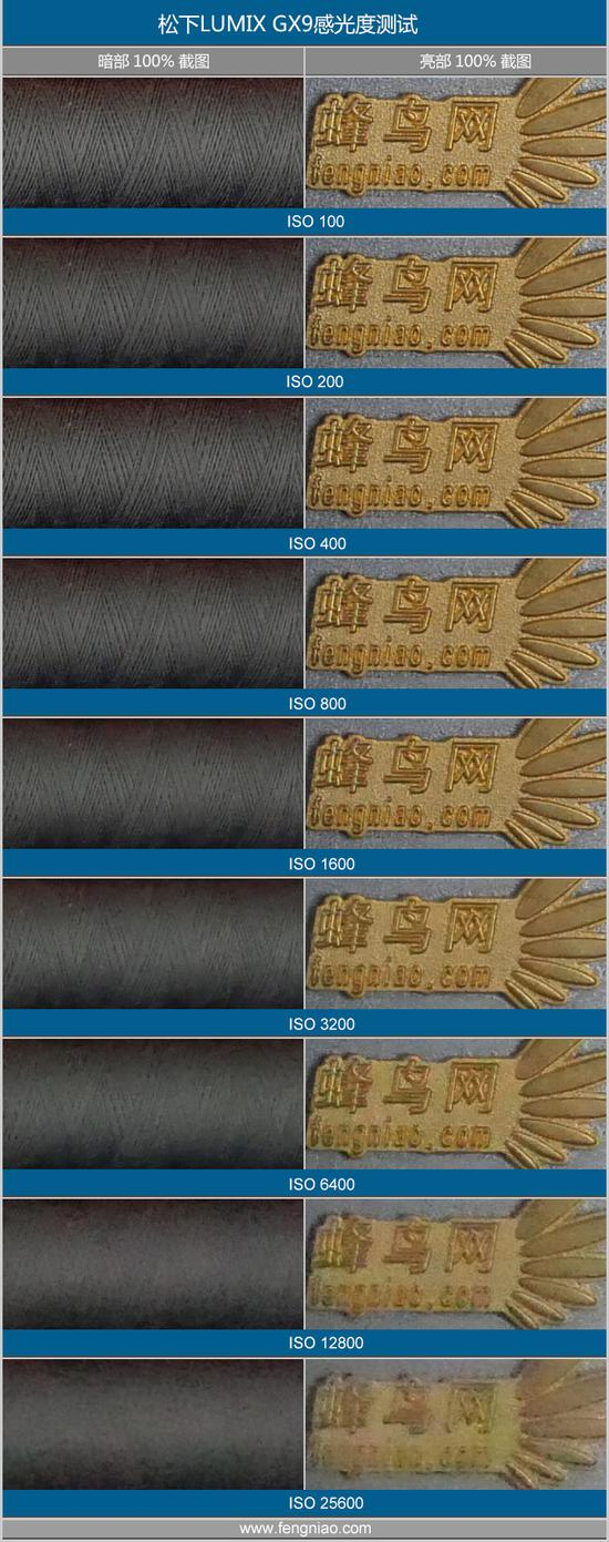 凭借我们测试数码相机的经验来看,对于M4/3画幅感光元件的无反相机来说,高感光度下的画质表现一直是一个挥之不去的阴影,但此前松下G9的表现已经让我们看到了惊喜,此次松下GX9采用的是和G9一样的图像传感器,那么其感光度表现到底如何呢?下面我们就在实验室环境中,来测试松下GX9在ISO 100-25600下各挡感光度下的画质表现(其中ISO 100为扩展感光度)。我们测试方法为逐级调整感光度,并保证曝光一致,关闭降噪功能并100%截图展示。