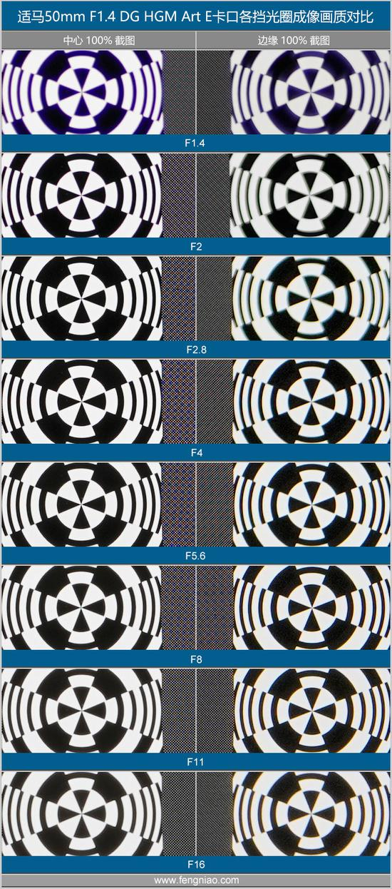 通过以上的图片,各位读者可以看出,在最大光圈F1.4时,适马50mmF1.4ArtE镜头表现出相对明显的暗角现象,在光圈收减一挡以后,暗角现象有所减弱但还是较为明显。当光圈收到F2.8以后,暗角现象逐渐稳定,但仍有一些,基本上与测试的20%衰减一致。从整体来看,适马50mmF1.4ArtE镜头在F2.8以后在暗角控制方面基本让人满意。