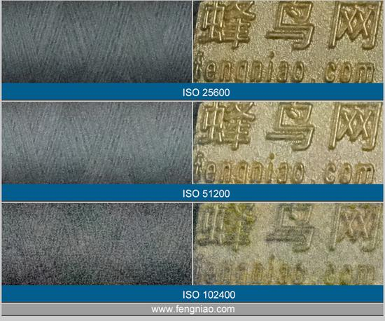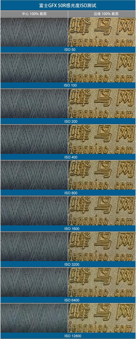 富士GFX 50R的传感器以及图像处理器和此前的GFX 50S一样,所以在原生感光度范围上也一致,为ISO 100-12800,可以扩展至ISO 50-102400。本次测试我们在室内进行拍摄,将机内高感光度降噪关闭,逐级调整感光度数值并保持曝光一致、JPEG直出的方式。以下为100%放大截图区域。