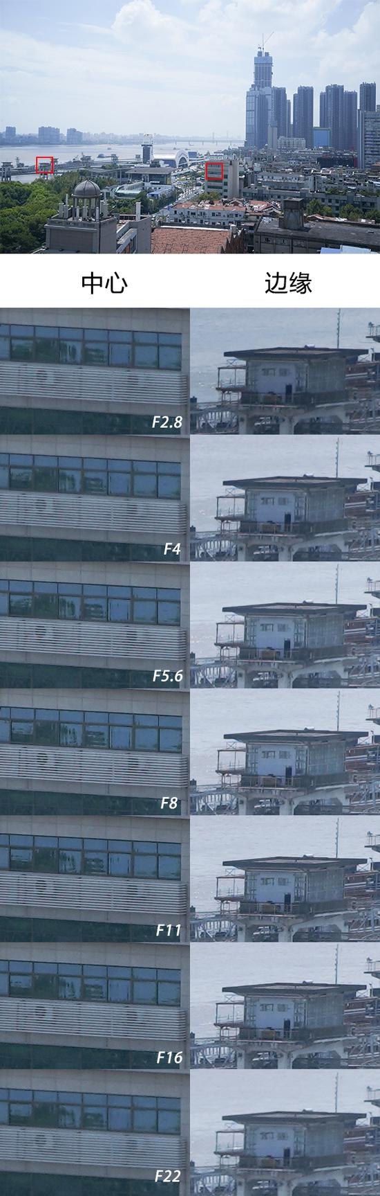 我们照例使用实拍+100%放大切片的方式进行测试。搭配使用的机身是4240万像素的索尼Alpha 7R III,使用三脚架+延时10秒拍摄,JPEG最高画质直出,截取照片中心和边缘红框所示位置的100%放大切片如下: