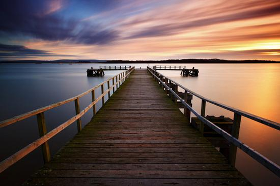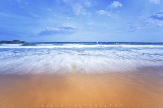 其实这张才是我拍摄的作品原貌,上面那张只不过是我把木桩通过PS去掉了。当大家在看到原本的这张作品时,视线的方向会被画面最下方的木桩子所引导,因为木桩子是从大到小渐渐的消失于海浪之中,所以我们视线的方向也会跟随者木桩子从下至上慢慢的去欣赏作品,这就是我们通过构图达成的作用。