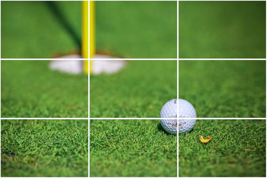 在九宫格当中,球和球洞都处在九宫格交叉点上,这代表这两个元素都是最标准的三分法构图,不论从左右看还是上下看都是画面的三分线,而且这两个元素互相形成的位置关系正好也是对角线的逻辑,所以这就是九宫格的便利之处。