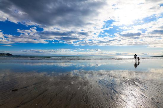 在逆光下,云彩在蓝天中蔓延,由于潮起潮落,浅水使天空和大海像镜子一样美丽。 看不到任何令人担心的耀斑,色彩表现鲜明。拍摄地是乌尤尼湖,从东京坐电车大概一个半小时就能到的地方。