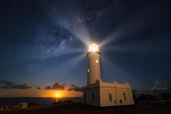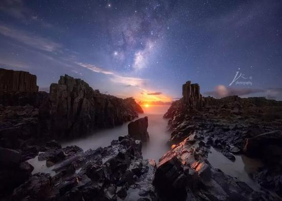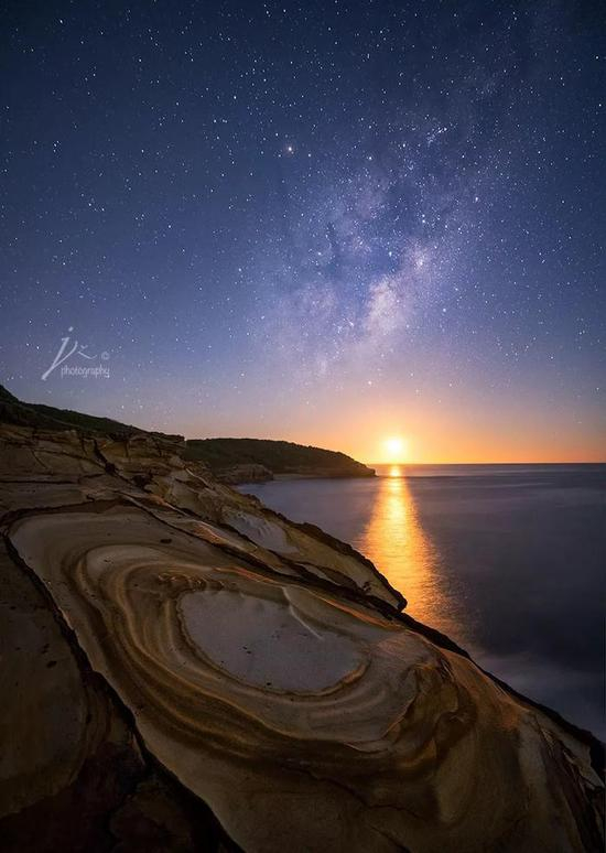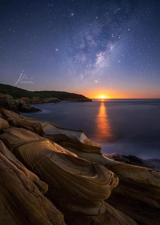 月升加银河的拍摄并不容易,娴熟的技术是成功拍摄的保障。