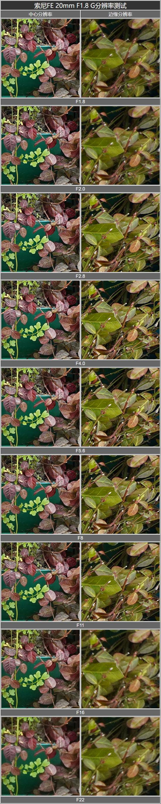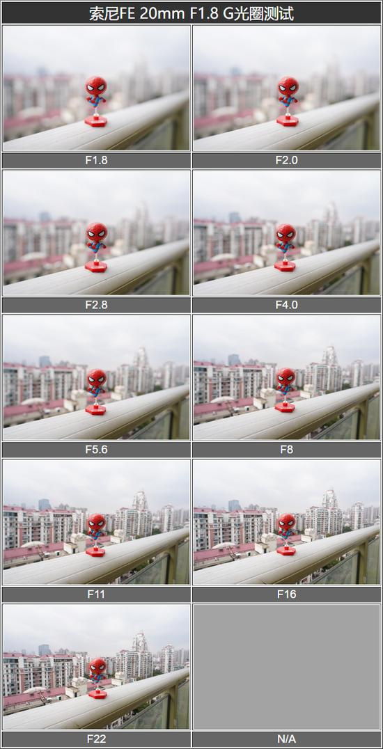 从测试图表中可以清楚看到不同光圈下背景虚化效果的不同。索尼FE 20mm F1.8 G在F1.8光圈全开的情况下,背景的虚化非常柔美漂亮。