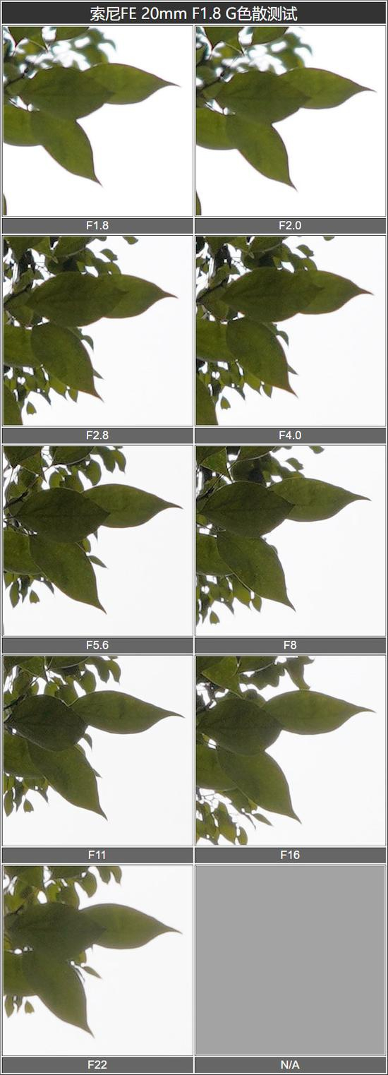 通过测试样张的100%截图后,我们可以看到索尼FE 20mm F1.8 G在控制色散方面的表现非常好,除了在F1.8和F2光圈下有着轻微的色散和紫边发生外,其它光圈下没有非常明显的色散情况和紫边发生。