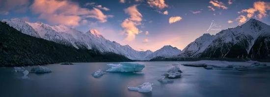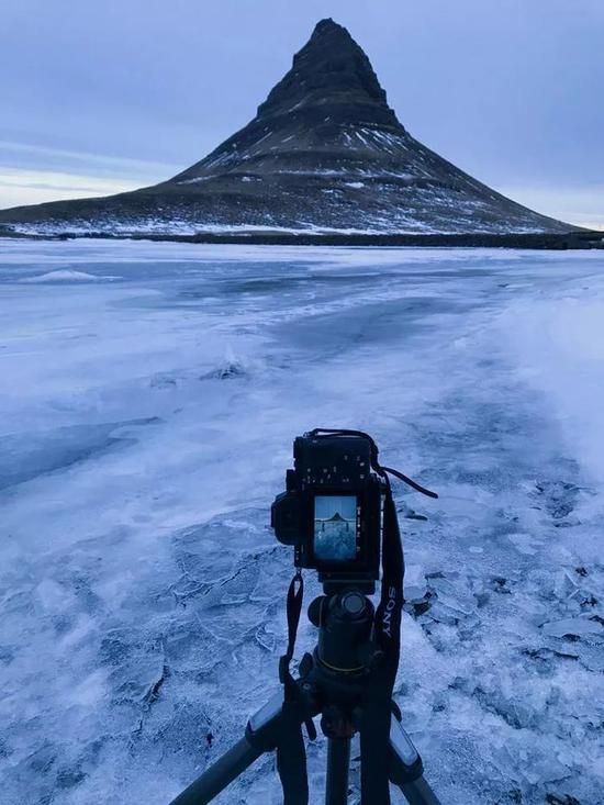 从以上现场工作照可以看出前景冰面的纹理离镜头的距离非常近,这种情况即使超焦距也不能保证整个画面都在景深范围内。这是目前摄影器材还无法解决的问题,解决的办法就是分别对焦前景冰面和远景的雪山,后期采用景深合成的方法,以实现照片从前景到远景都清晰的高画质图像。