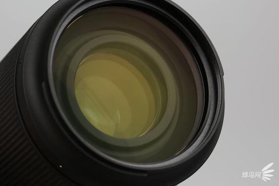 前文也提到,这款镜头在用料上颇为豪爽,从前镜组来看呈现淡淡的黄绿色镀膜,卡口采用了金属的卡口结构。