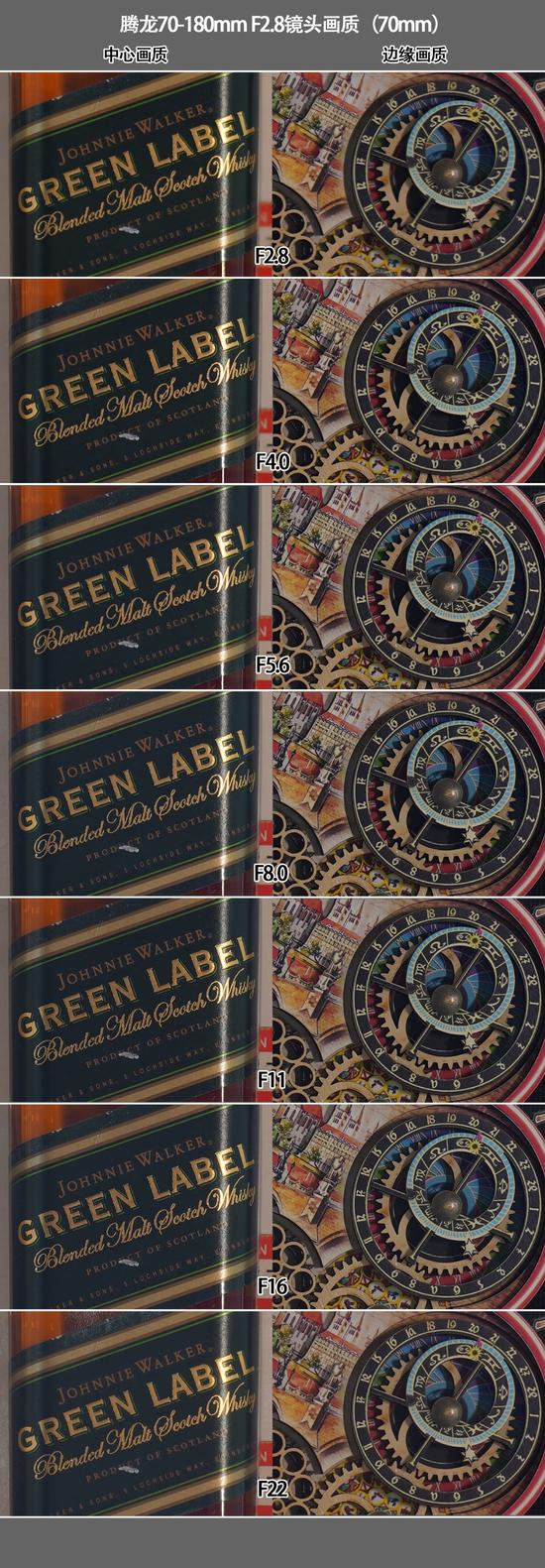 首先是70mm广角端:可以看到,这支腾龙70-180mm F2.8 Di III VXD镜头在广角端F2.8全开下就有着不错的分辨率表现。无论是中心区域,还是画面边缘,镜头在F2.8全开下的表现都相当不错。而随着光圈收缩1挡后,镜头的解析力和锐度会明显提升达到最佳水准。一直到F8.0时,镜头仍然有着不错的分辨率,而在更小的F11等光圈下,保证画面足够的分辨率和细节表达,镜头的表现也是没问题的。