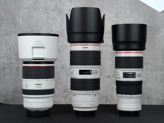 左侧RF70-200mm F2.8 L IS USM镜头,相对于EF同规格镜头体积更加紧凑。