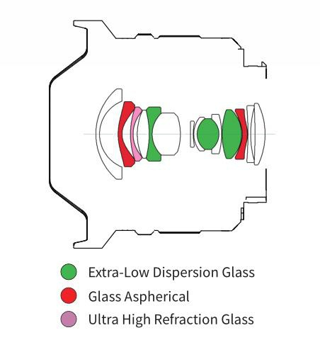 镜头结构采用2片非球面镜片,和3片ED镜片,保证镜头锐度,大大降低了色散和畸变,同时提高了边缘画质。