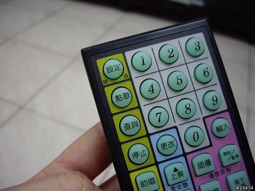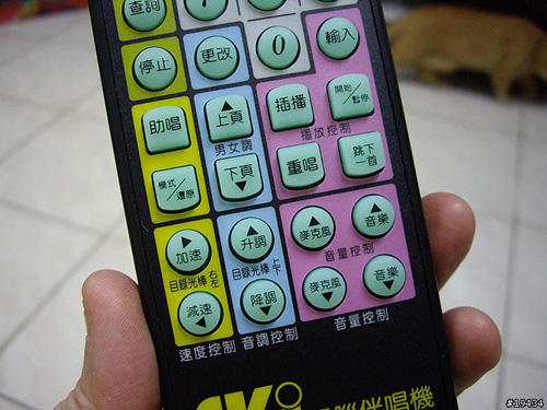 遥控器在来特写一下,按下点歌钮就可以用各种方式点选歌曲,或是可以直接输入曲号来点歌,查询钮的功能就可以叫出已经点播的歌曲清单。 。留意一下『0』下方的插播功能,突然看到想唱的歌,前面又点了一堆吗?插播是好功能阿。