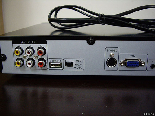 后面接头特写,有两组的AV OUT、USB/OTG功能接口、VGA接头、S-VEDIO接头、IR扩充接口。 SK 02将开关切到OTG功能时,可以直接读取复制USB设备里的多媒体档案(不过说明书里面有提到如果硬碟已经格式化为点歌用时,别使用OTG的好,有磁碟顺序错乱的可能性。)。如果切到USB,搭配USB连结线,就立刻变成硬碟外接盒,因此可以轻易的自己传输多媒体档案到客厅大萤幕观赏,自然也可以自己下载新歌后自行输入,不需要求人啦。