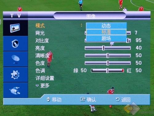 在一开始,笔者想见识一下三星LA46A650A1R液晶电视的信号源菜单,结果这款产品采用“来电通”设计,自动检测信号源输入,没有相关音视频接入时,不能进入相关状态。三星LA46A650A1R液晶电视共有TV、图像、伴音、设置、输入五大项主功能菜单,像100Hz M0TION plus、Anynet+等都为这款产品独特之处,并且三星LA46A650A1R的图像菜单选项非常丰富,感兴趣的朋友可以去卖场试用一下。