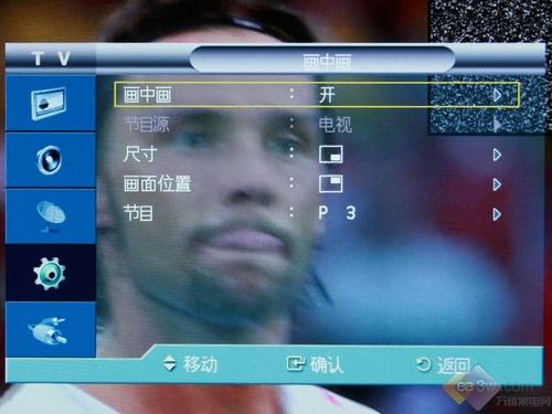 三星LA46A650A1R液晶电视还拥有画中画的功能,当此功能开启时,默认状态下,屏幕右上角会出现一个小画面,如果你有其它视频信号输入,你可以通过节目源进行选择。另外,三星LA46A650A1R还可以对小画面的尺寸及位置进行调节。