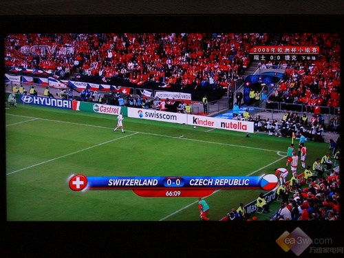 完成了一些简单的产品介绍部分,我们下面来实际体验一下这款产品播放高清信号的效果。首选,我们使用一款无线高清机顶盒通过HDMI接口连接三星LA46A650A1R液晶电视,体验刚刚5月1日刚刚推出CCTV高清综合免费频道,此时CCTV高清频道播放的是重播欧洲杯小组赛瑞士对捷克。